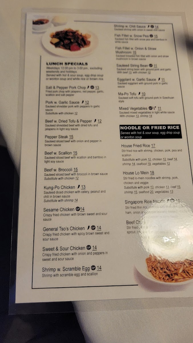 Additional menu highlights include a range of meat and vegetable dishes such as House Crispy Duck, Sweet and Sour Chicken with Broccoli, Sesame Chicken, Pan-Fried Noodles with Seafood, Garlic Eggplant, and Sautéed Pea Shoots. Beverage options include beer to complement the meal.