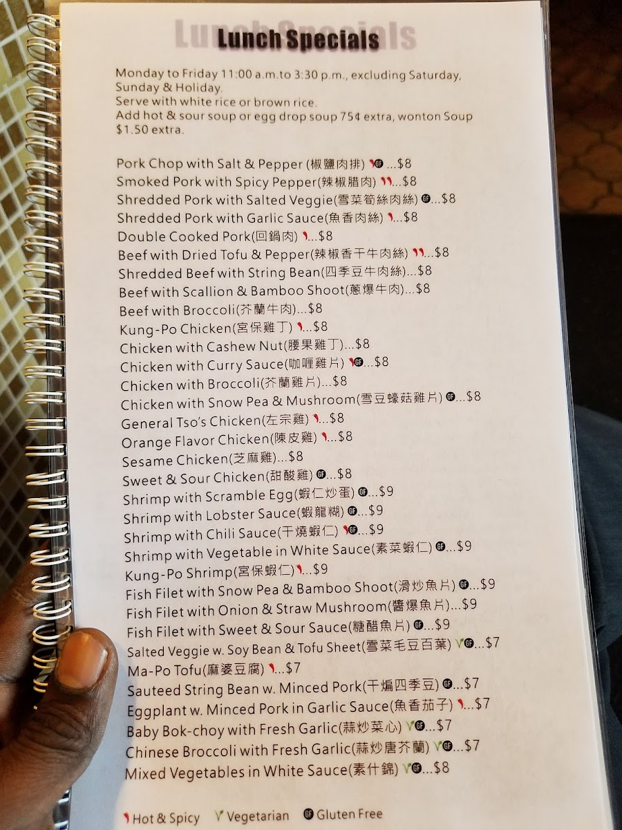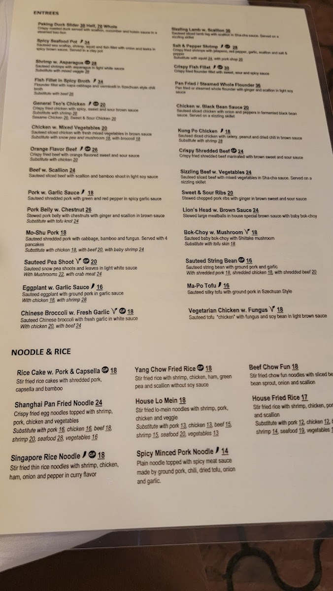 Fish selections include whole flounder prepared either steamed or pan-fried, highlighting fresh seafood preparations.